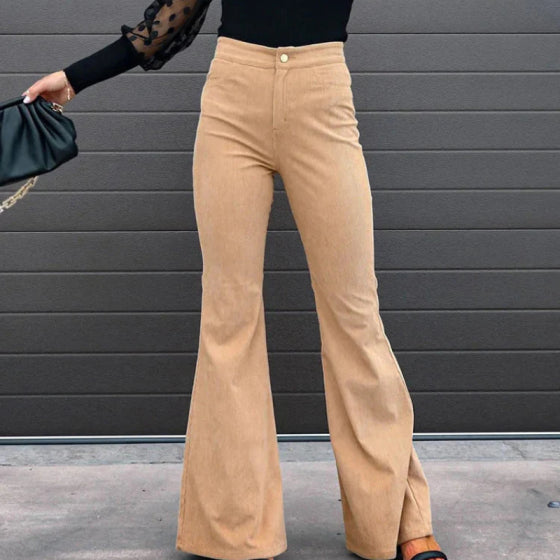 The VelvetFlare trousers are a stylish addition to your wardrobe. Made from soft corduroy fabric, these trousers offer a comfortable fit and a trendy flared design that is perfect for various occasions.